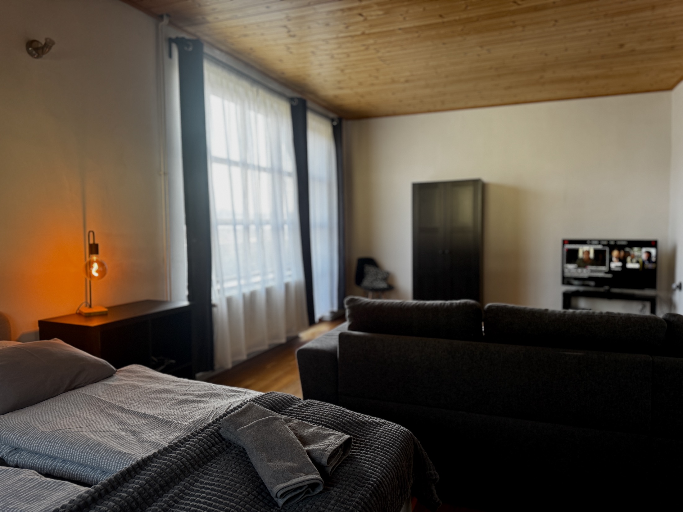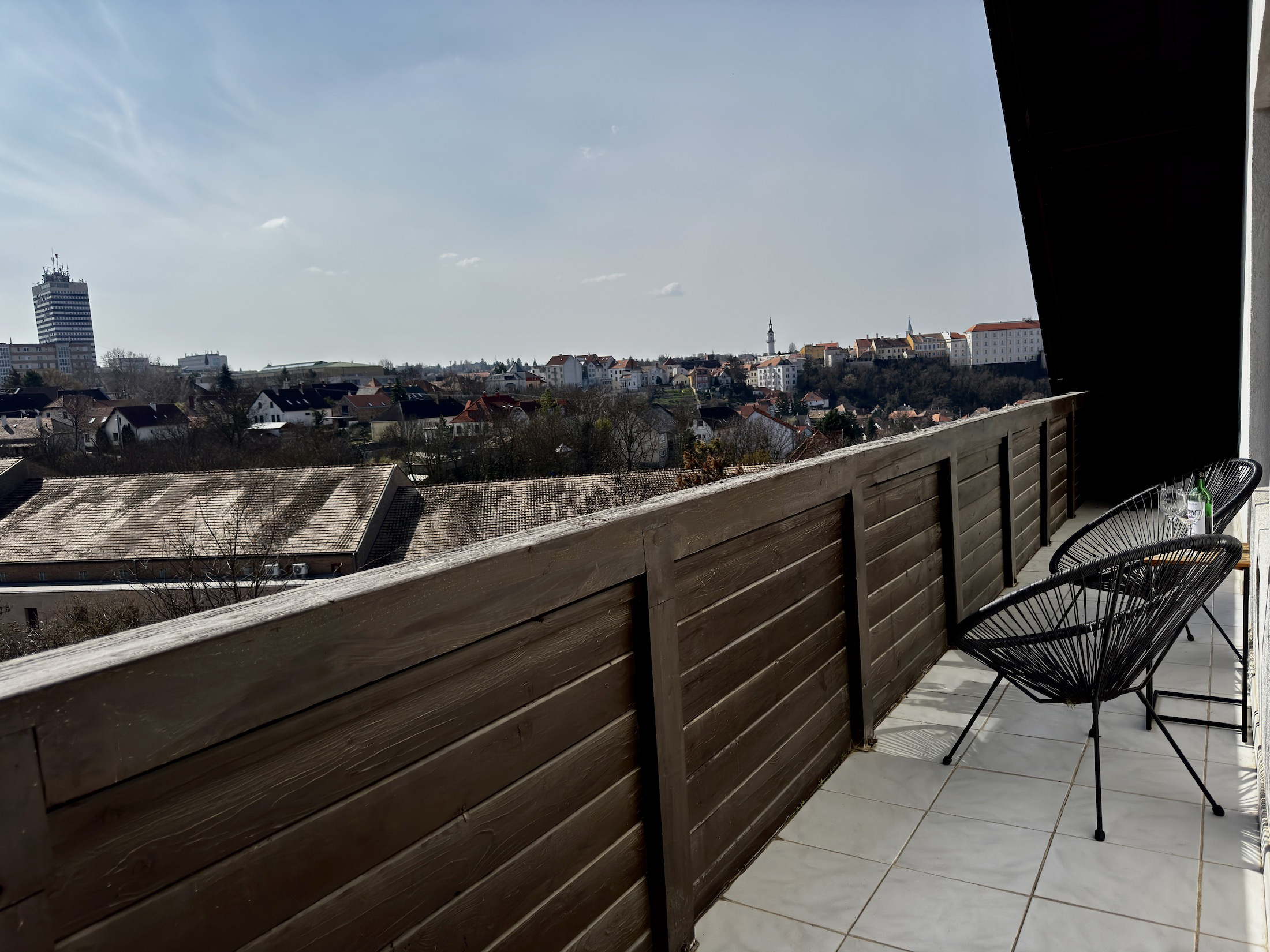 Az apartmanhoz saját fedett erkély tartozik, ahol kényelmesen elfogyaszthatod a reggeli kávédat, miközben a belváros és a Tűztorony csodás látványa tárul eléd.